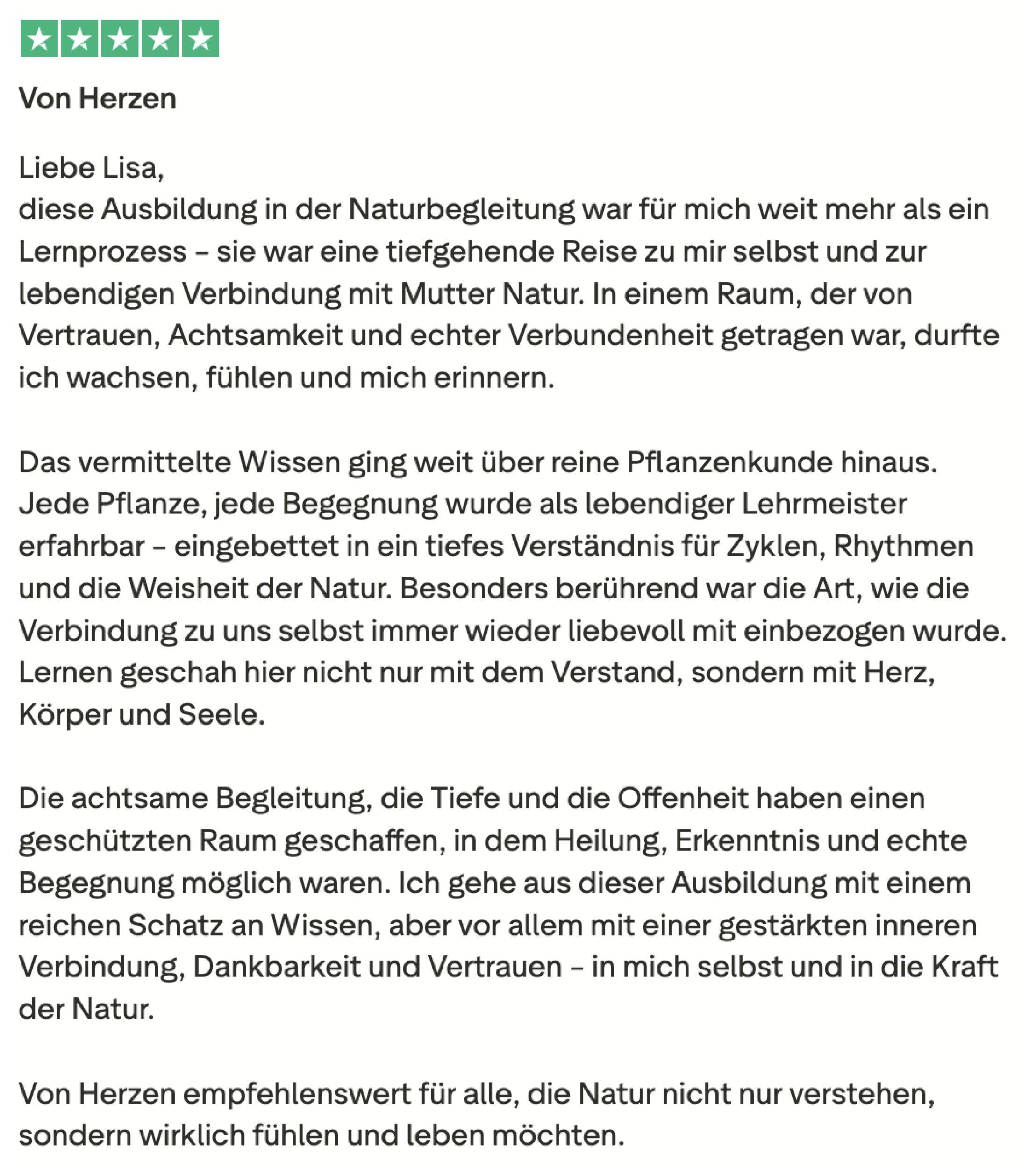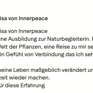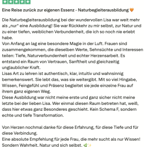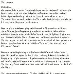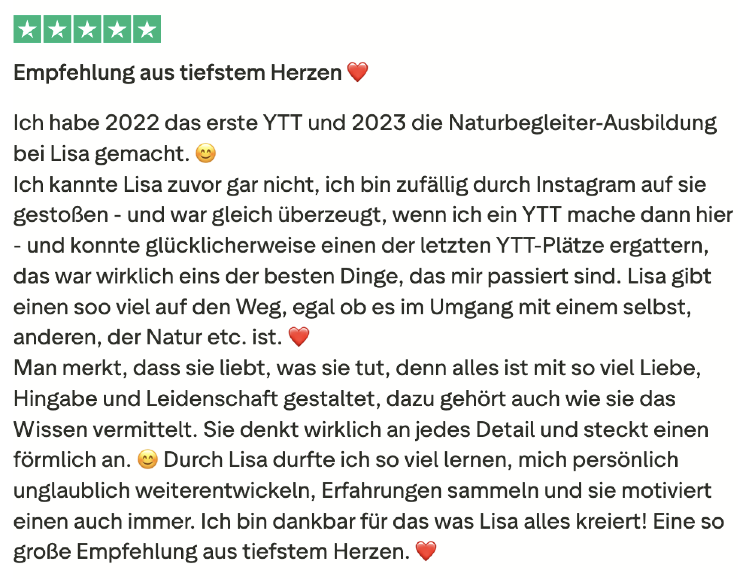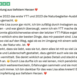 Johanna, Teilnehmerin 200h Teacher TrainingLiebe Lisa, Du machst das so wundervoll! Ich gehe jedesmal nach der Einheit beschwingt und mit einem super Körpergefühl nach Hause. Ich bin froh, dass du Yogastunden gibst und wir daran teilhaben dürfen!